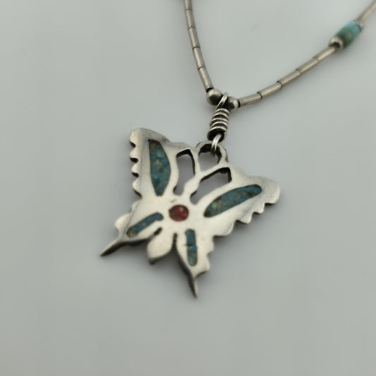 Vintage Native American Sterling Silver Butterfly Necklace 925 Turquoise Coral Inlay 15"
