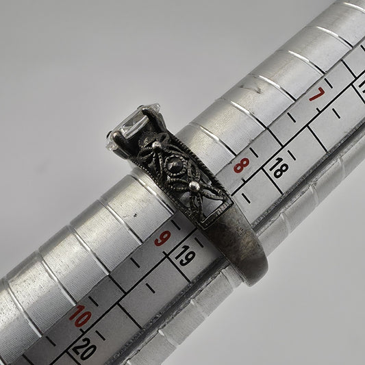 Sterling Silver Ring Filigree White Clear Stone Size 9 Vintage Patina
