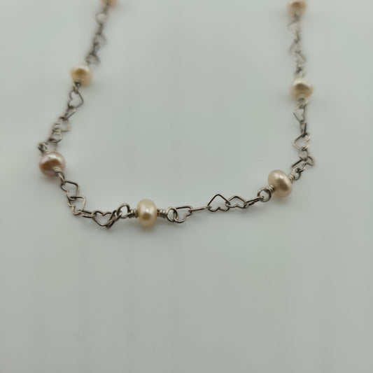 925 Sterling Silver Heart Links ❤️ Pearls Necklace Jewelry 16 Inches