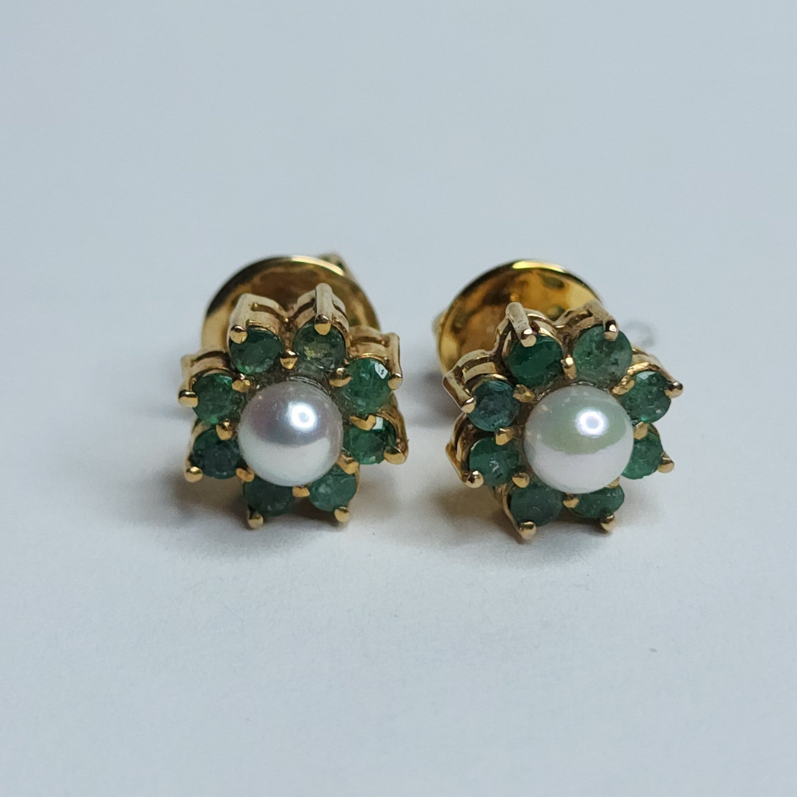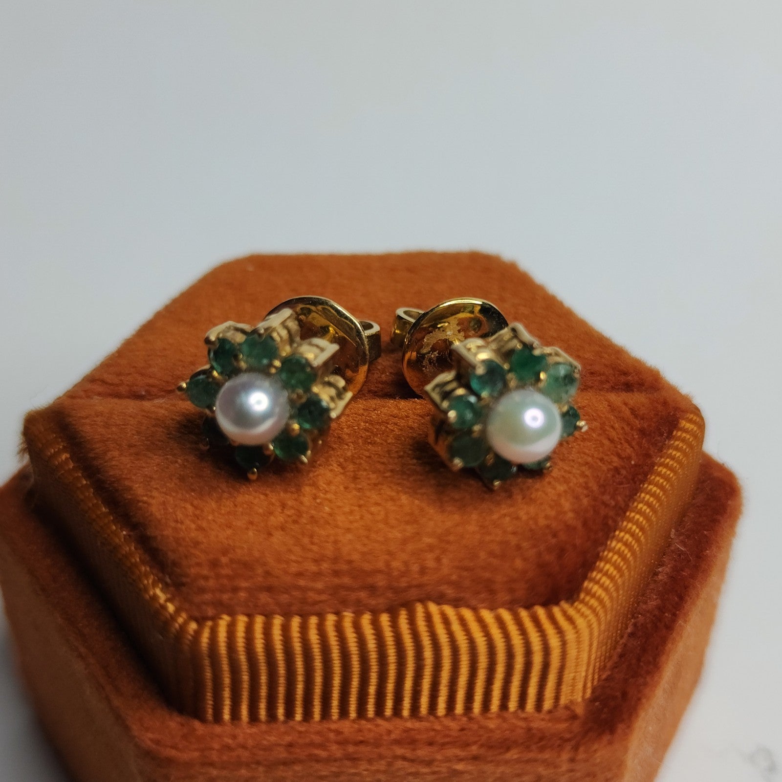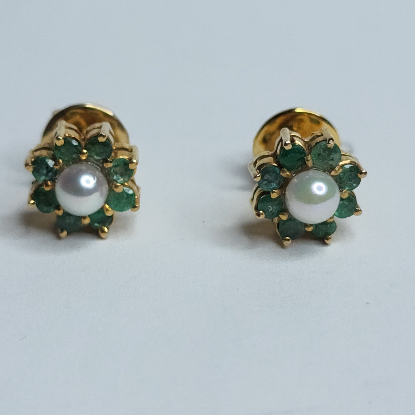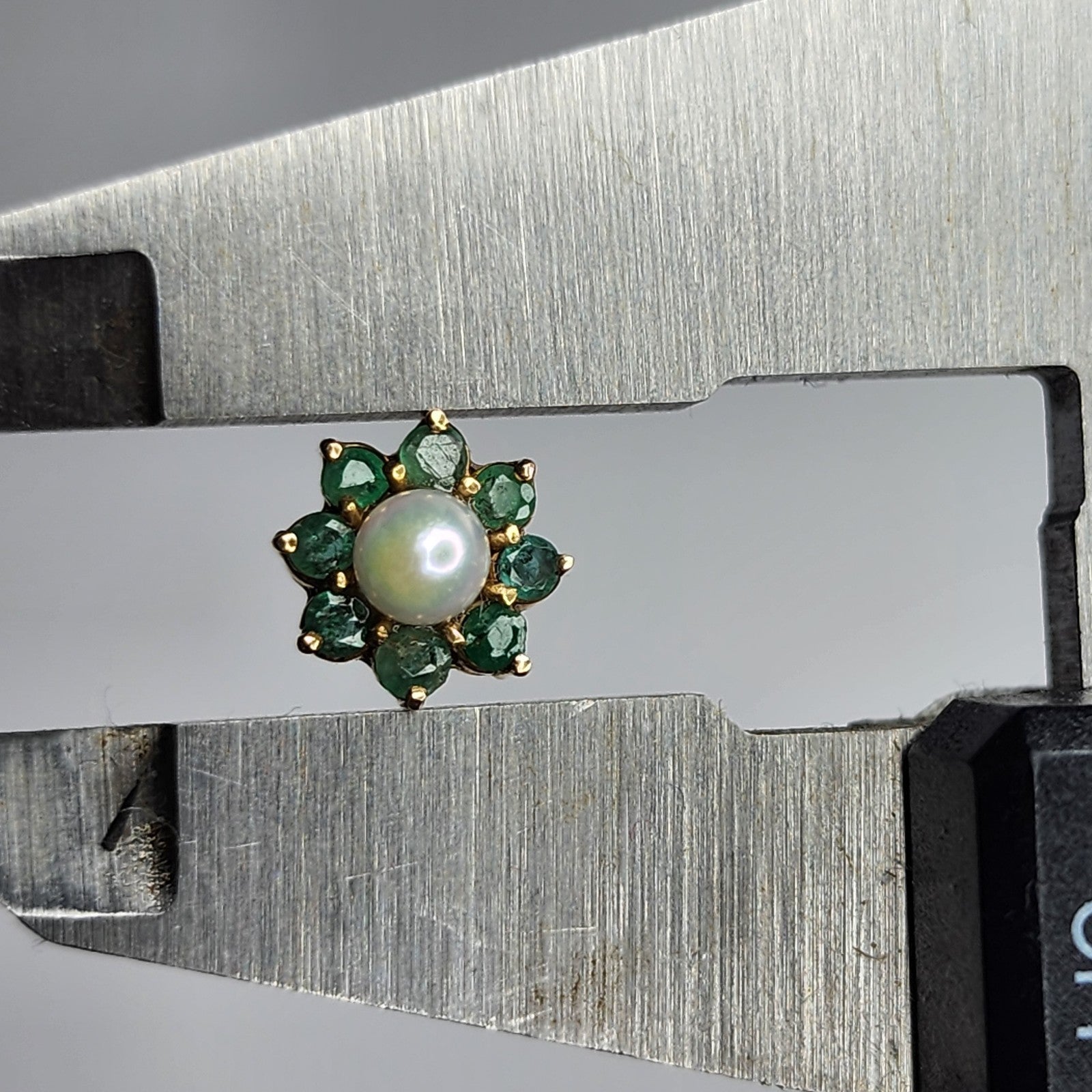 14K Yellow Gold Earrings White Pearls Flower Green Stones Stud 9mm 585
