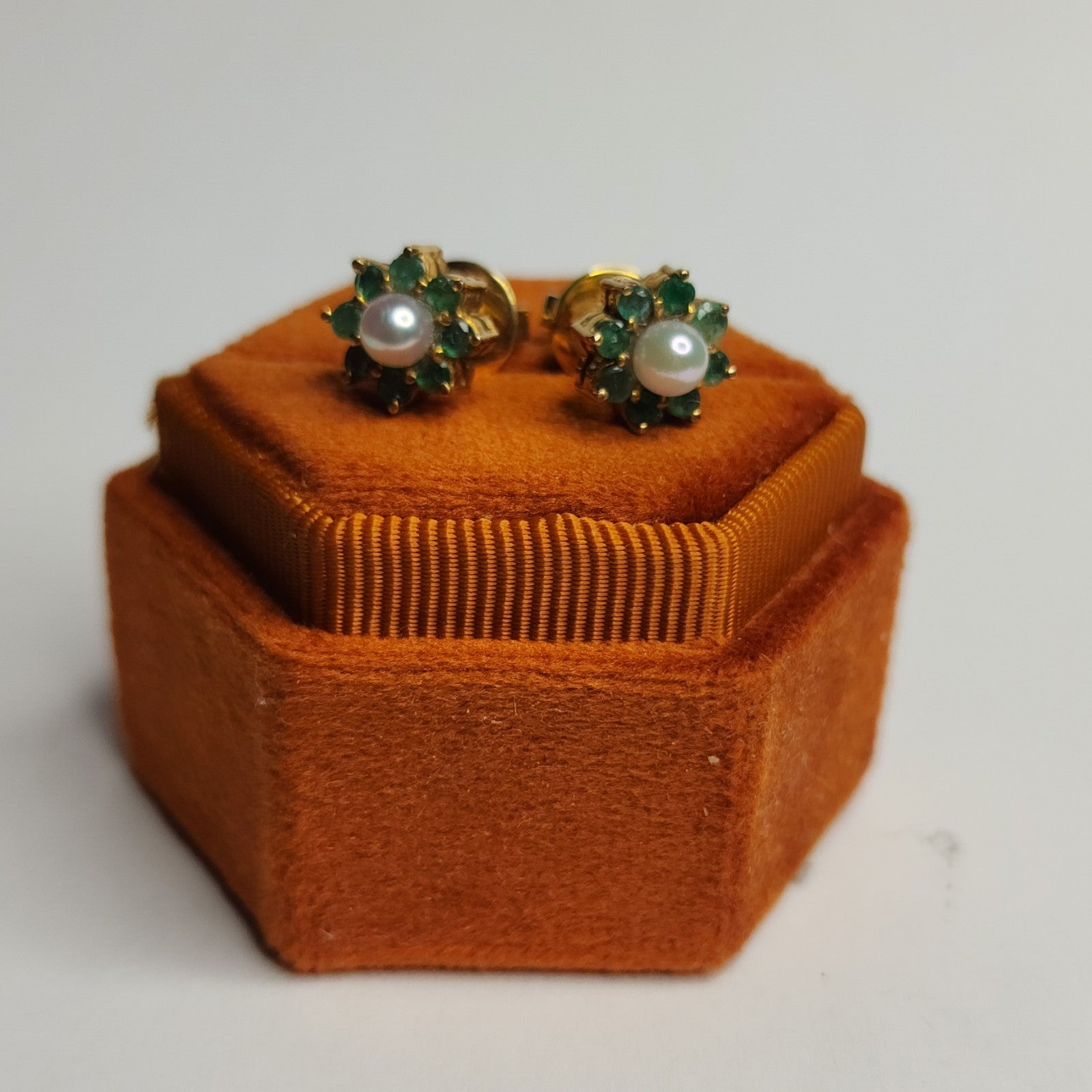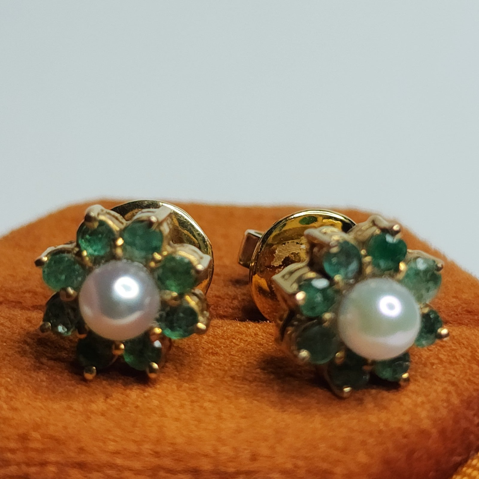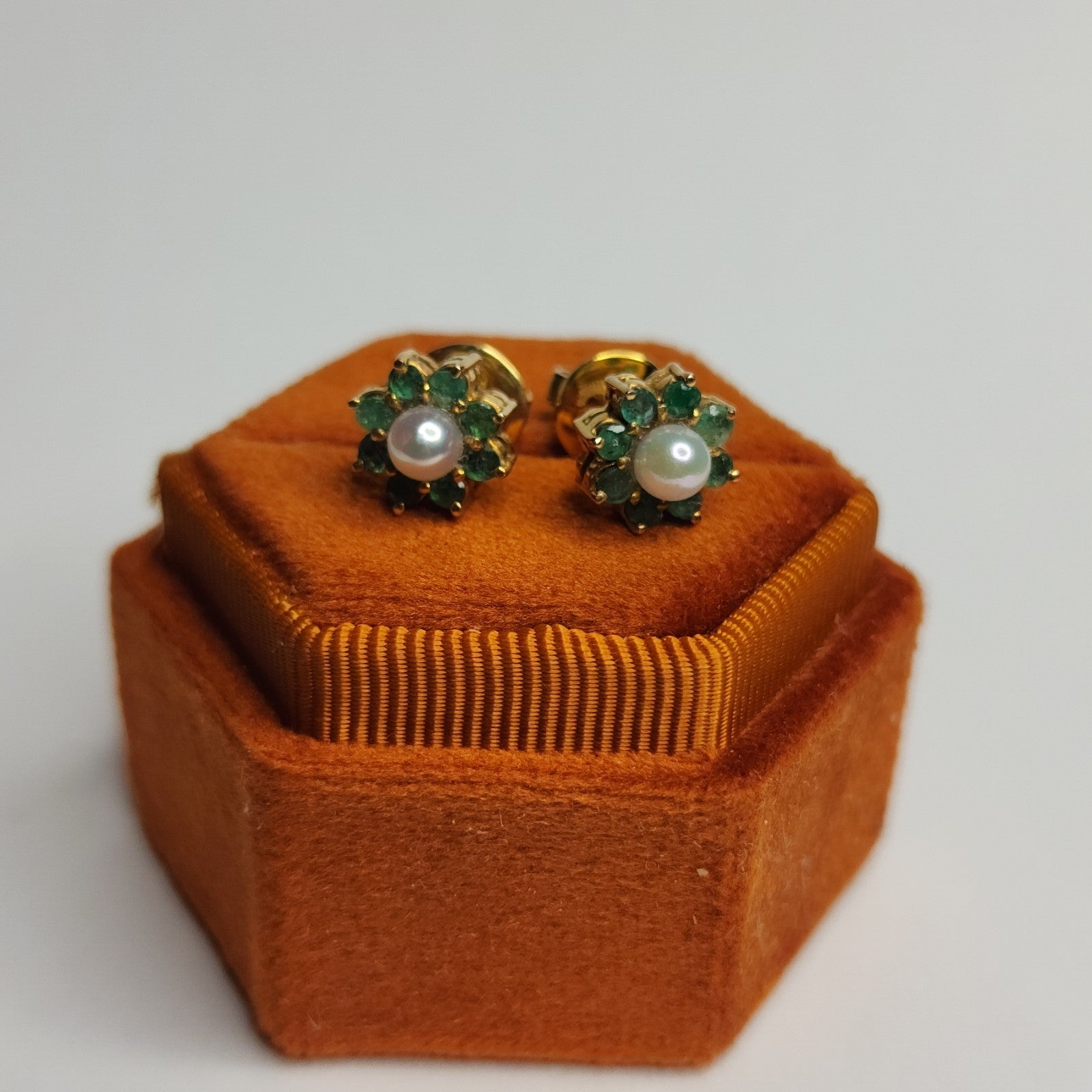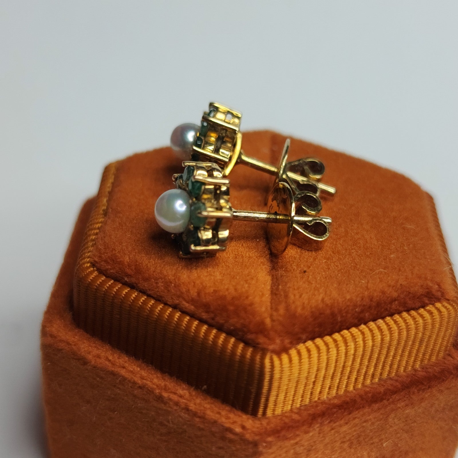 14K Yellow Gold Earrings White Pearls Flower Green Stones Stud 9mm 585