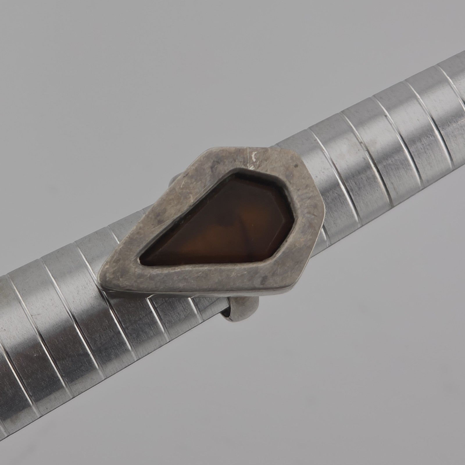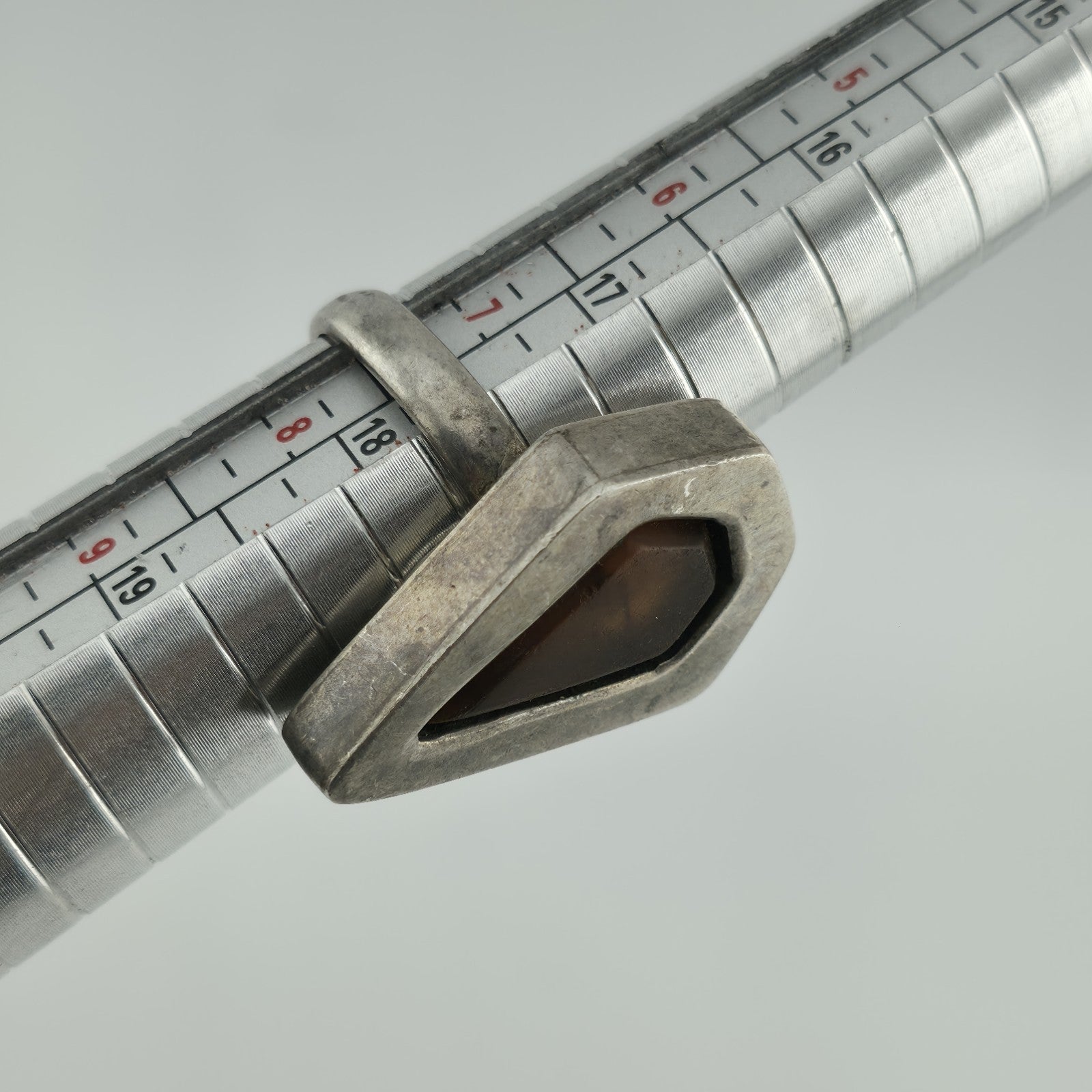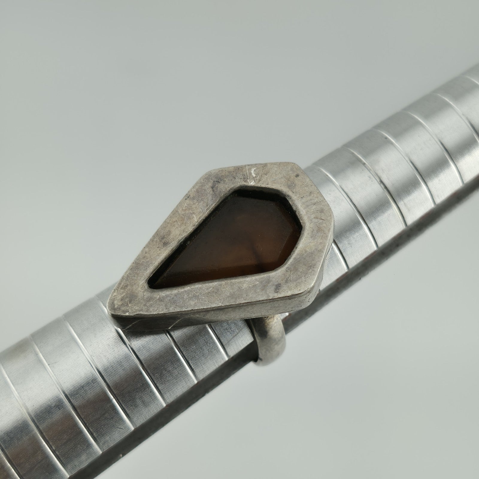 This striking vintage modernist ring features a teardrop-shaped amber stone set in a bold sterling silver bezel. The warm honey tones of the amber contrast beautifully with the smooth silver, giving the piece an earthy yet contemporary vibe.