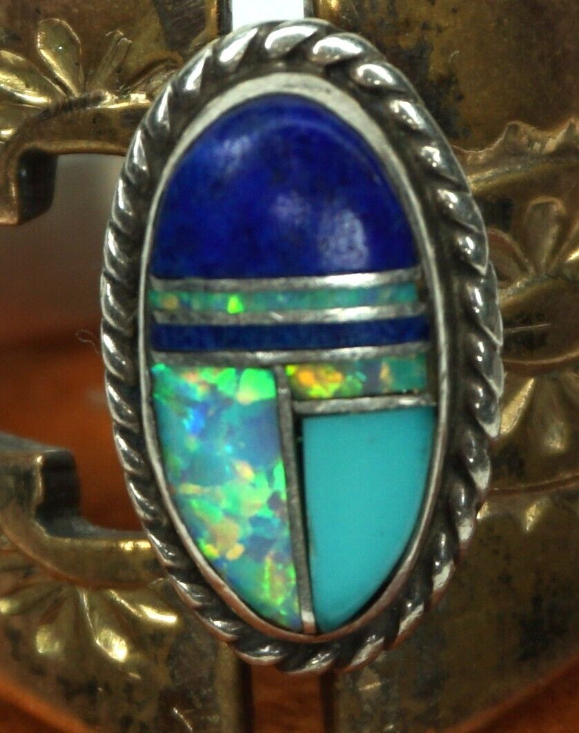 💍 Larry Pacheco Vintage Sterling Silver Ring Size 7 – Lapis, Opal & Copper Inlay – Southwest Style