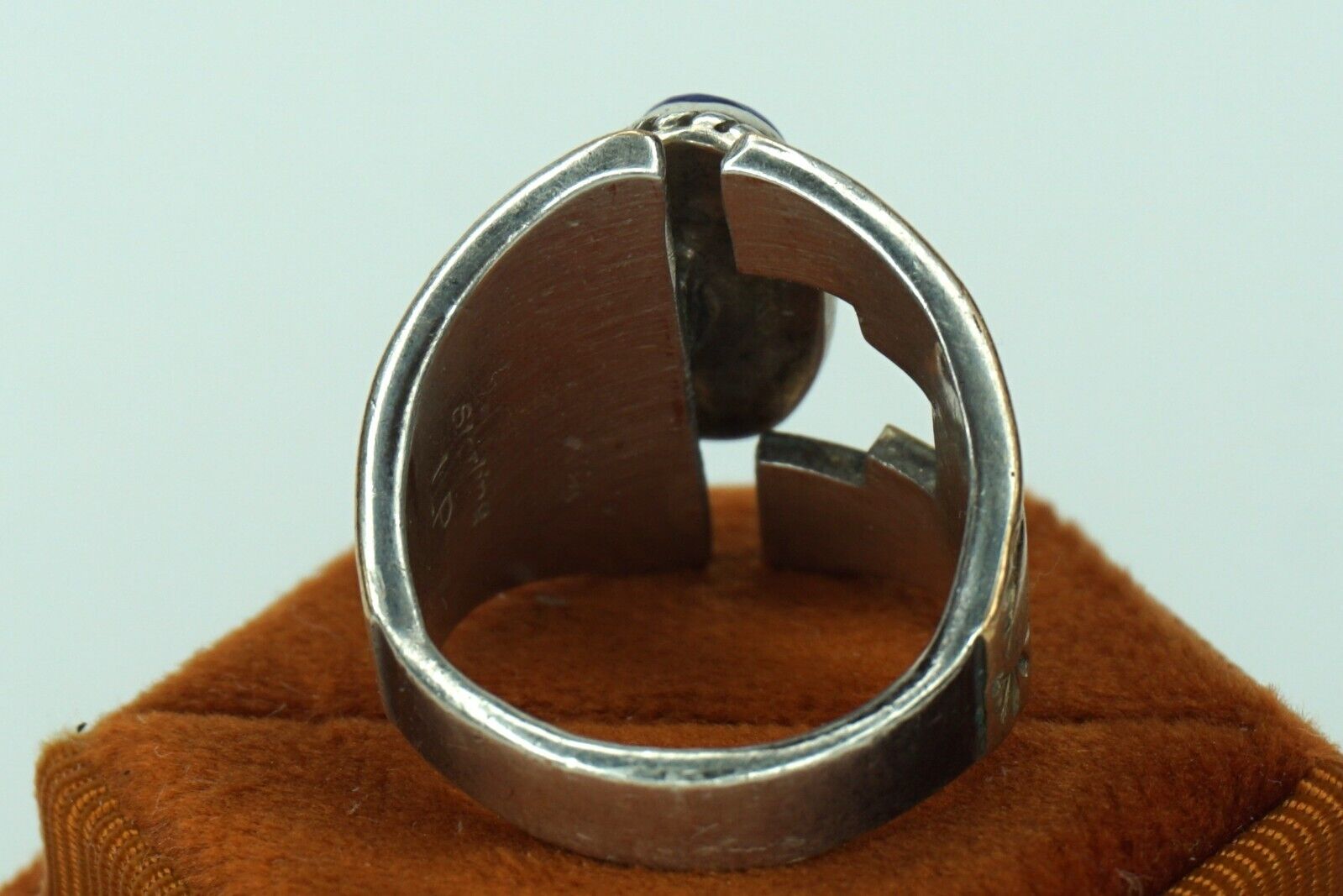 A stunning vintage piece handcrafted by artisan Larry Pacheco, featuring a bold and colorful inlay of Lapis Lazuli, Opal, and Copper. This unique Southwest-style ring is a beautiful blend of natural stones and traditional craftsmanship.