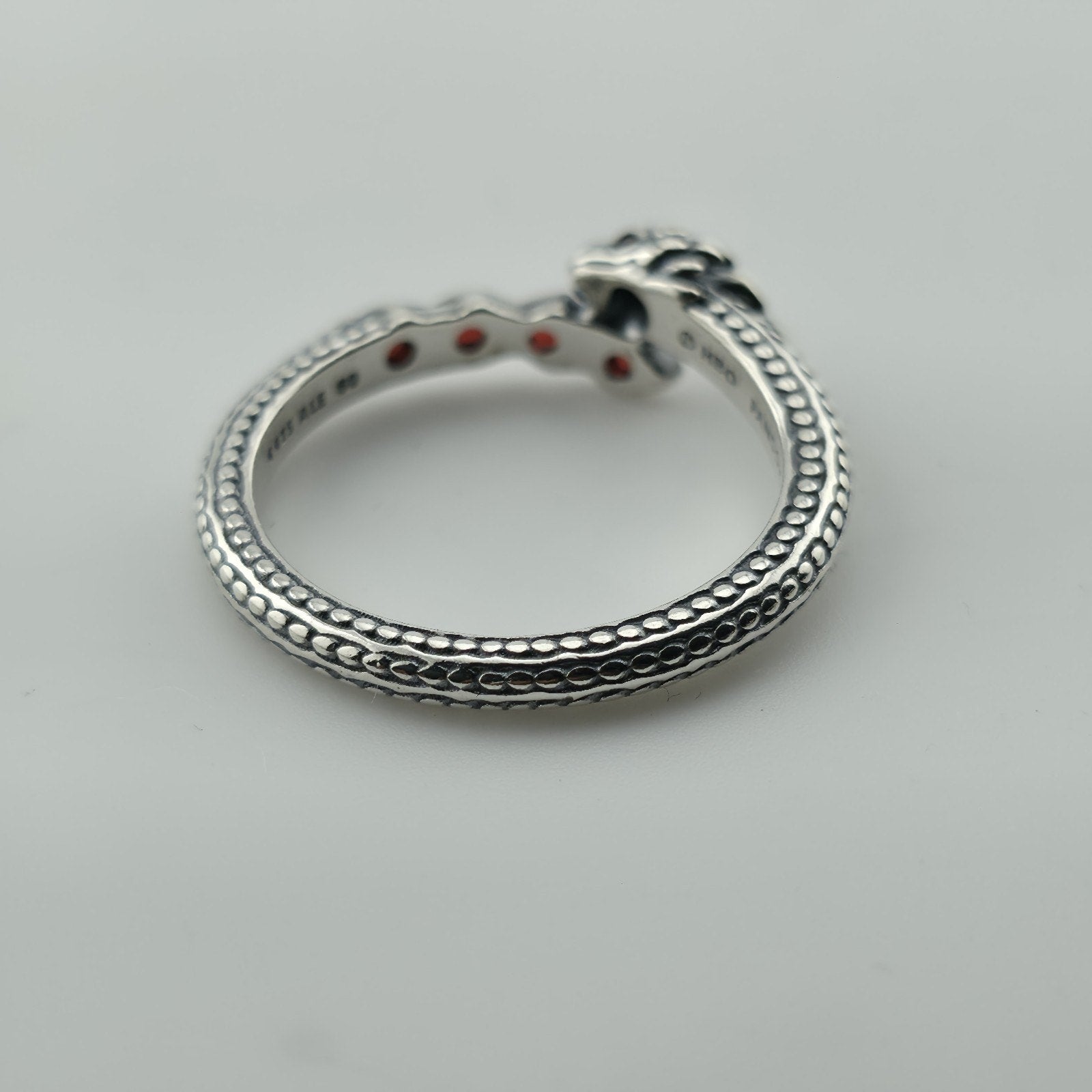 Authentic Pandora Game of Thrones Dragon Ring crafted in sterling silver. This detailed wrap-style ring features a dragon design with sparkling red crystals, representing the dragon’s head and tail. A perfect statement piece for Game of Thrones fans or collectors of Pandora jewelry.