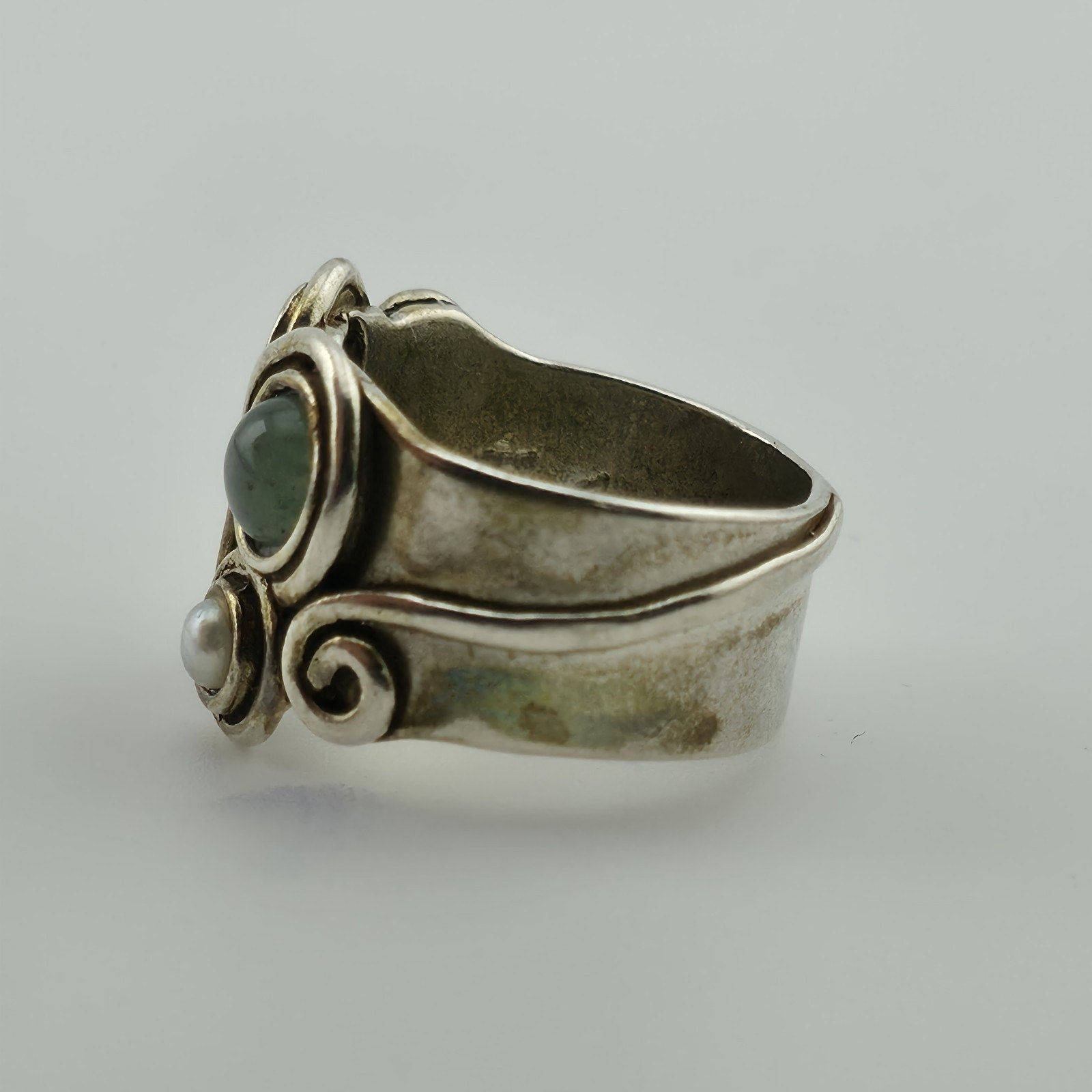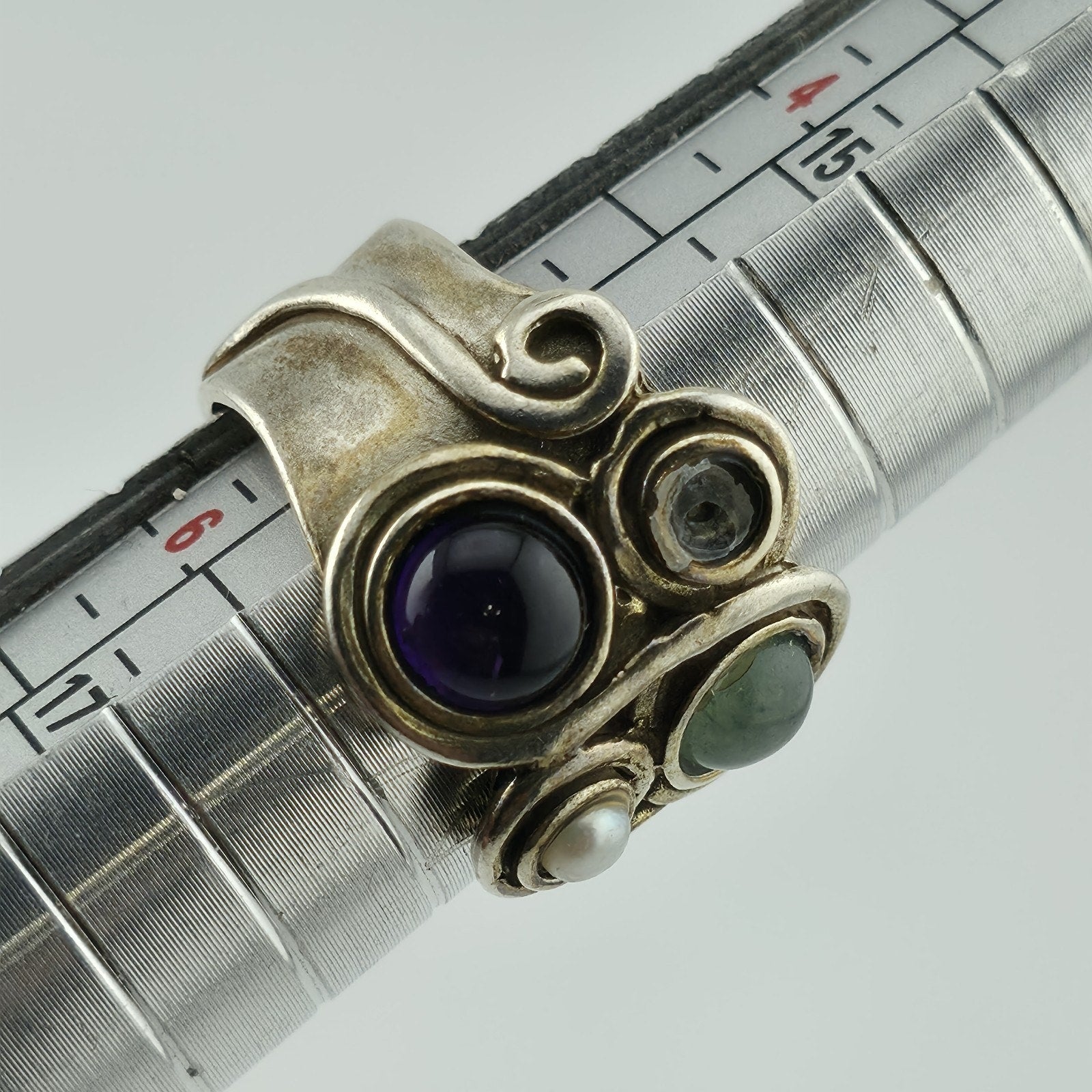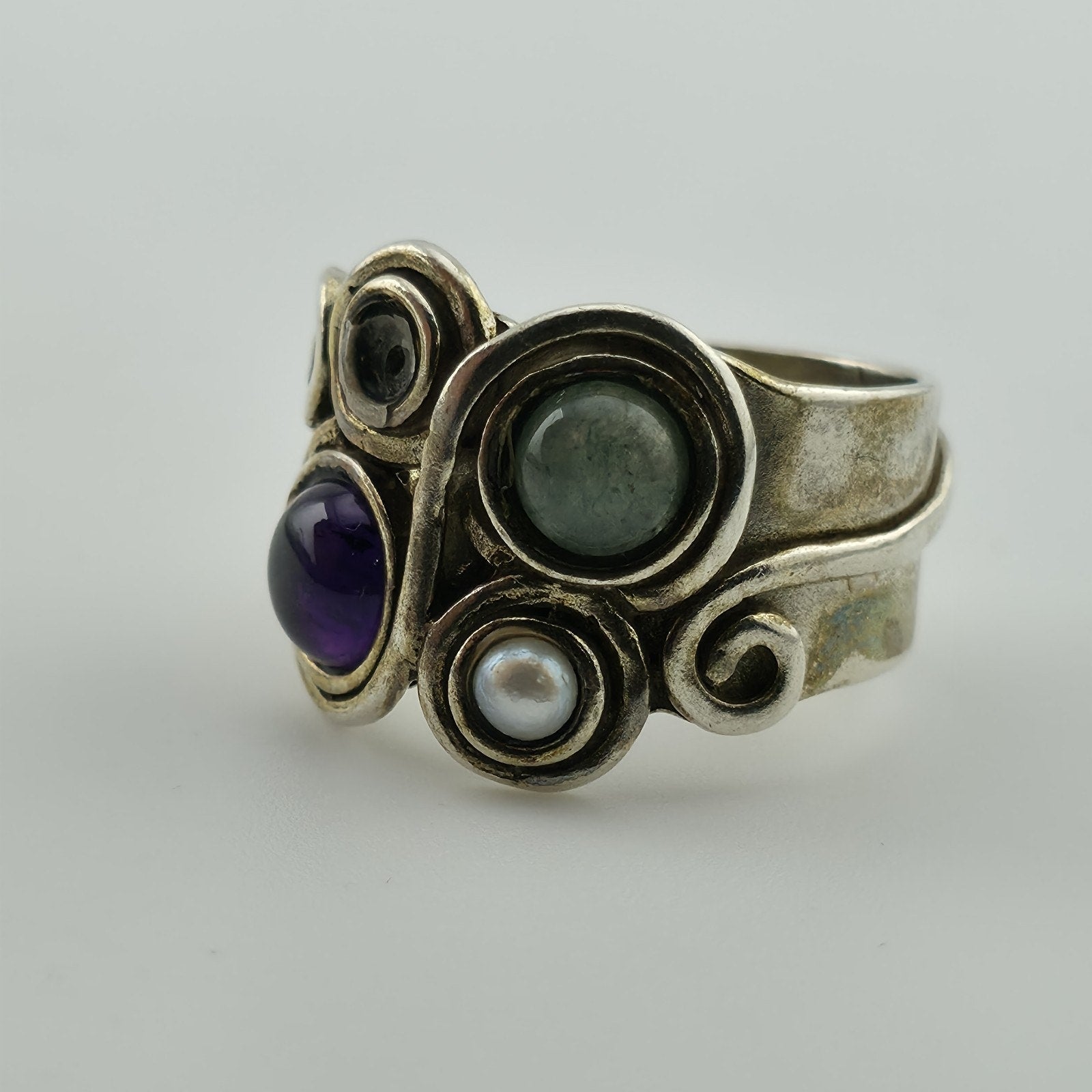 Unique sterling silver artisan ring featuring a bold multi-stone design with a mix of gemstones including a purple amethyst-like stone, green stone, pearl, and a dark cabochon. The ring has an organic, handcrafted look with swirl details and a chunky band.