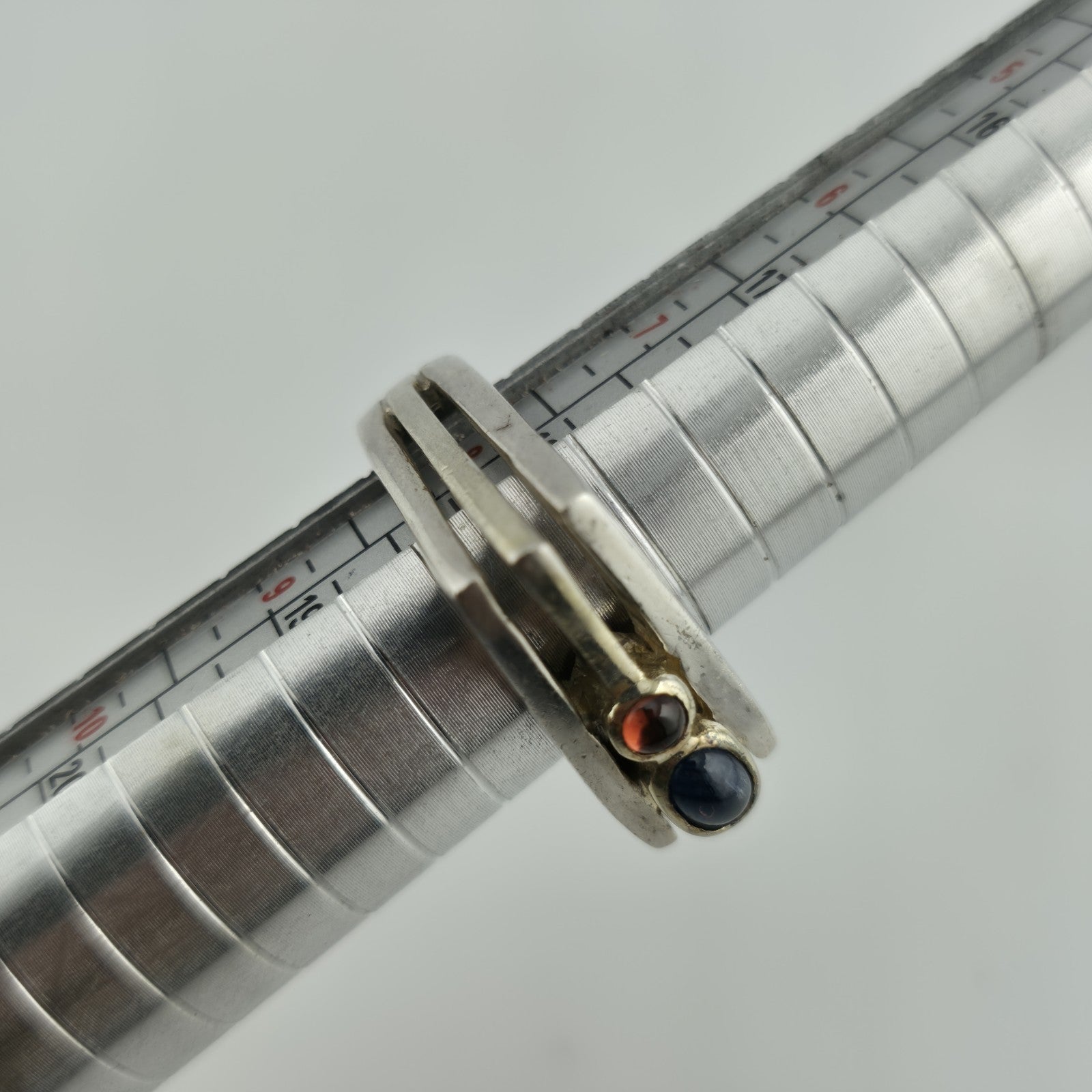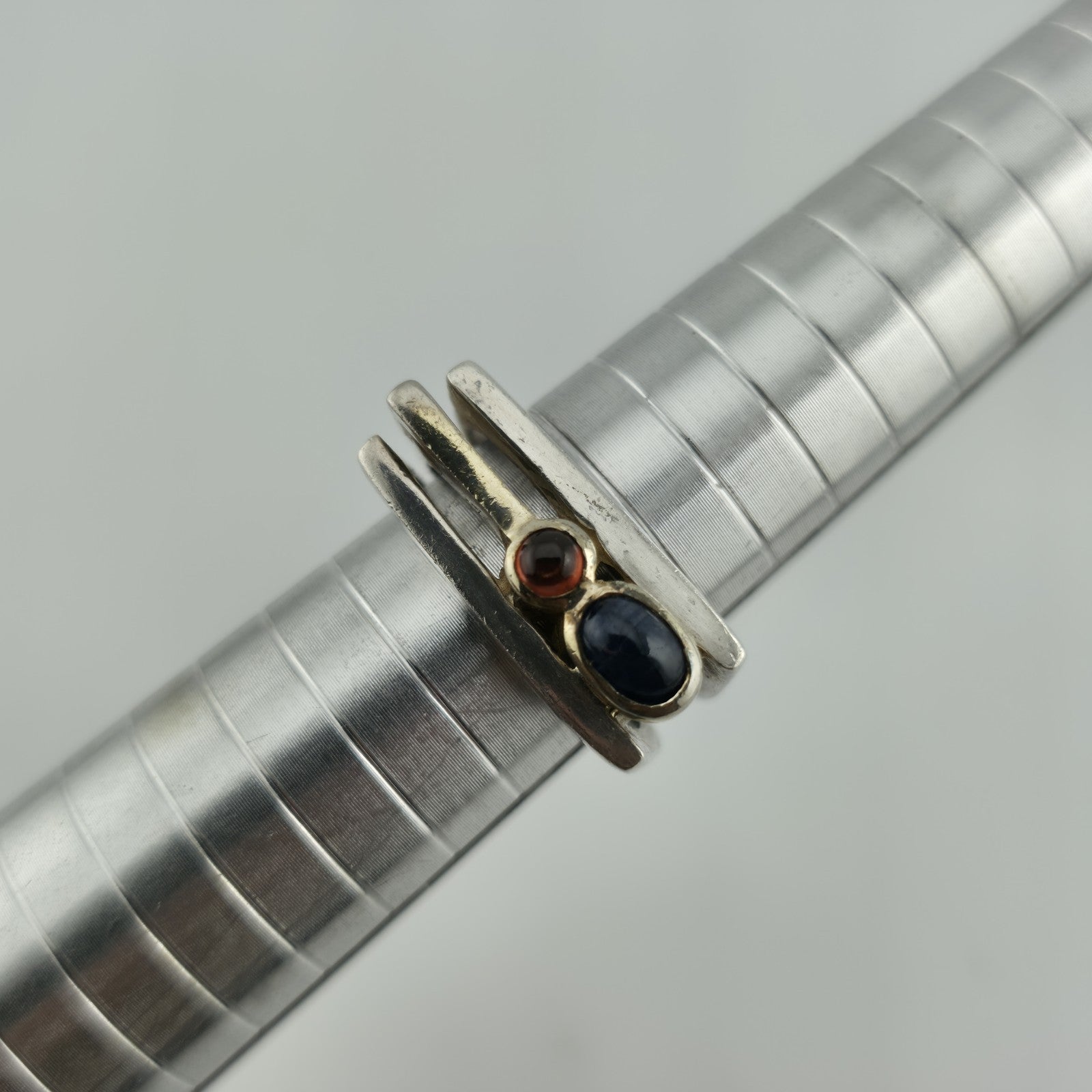 This vintage modernist sterling silver ring features a unique bypass design with two bezel-set stones — one deep blue and one rich red. Its sculptural style and bold lines give it a timeless mid-century appeal, while the stones add a pop of color and personality.