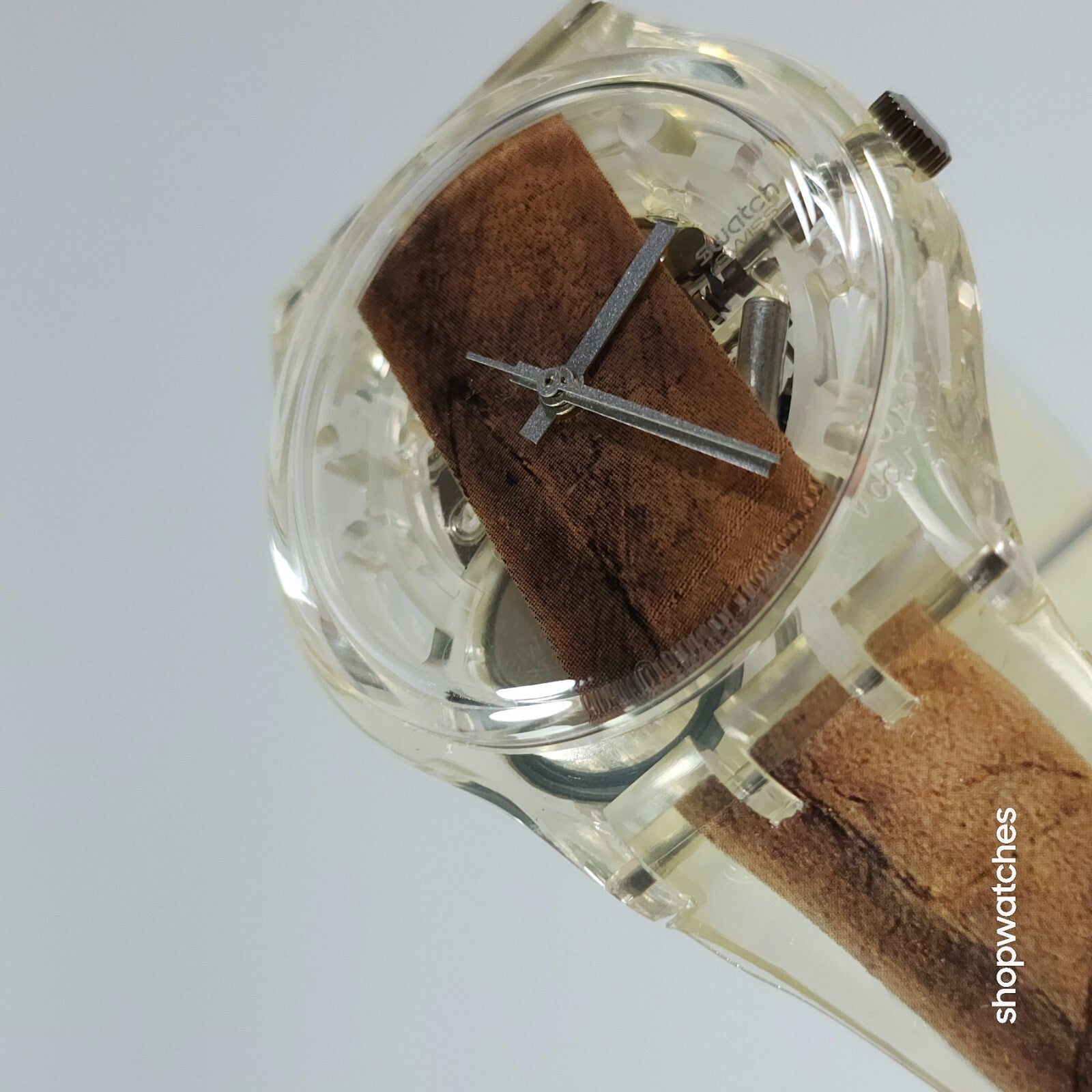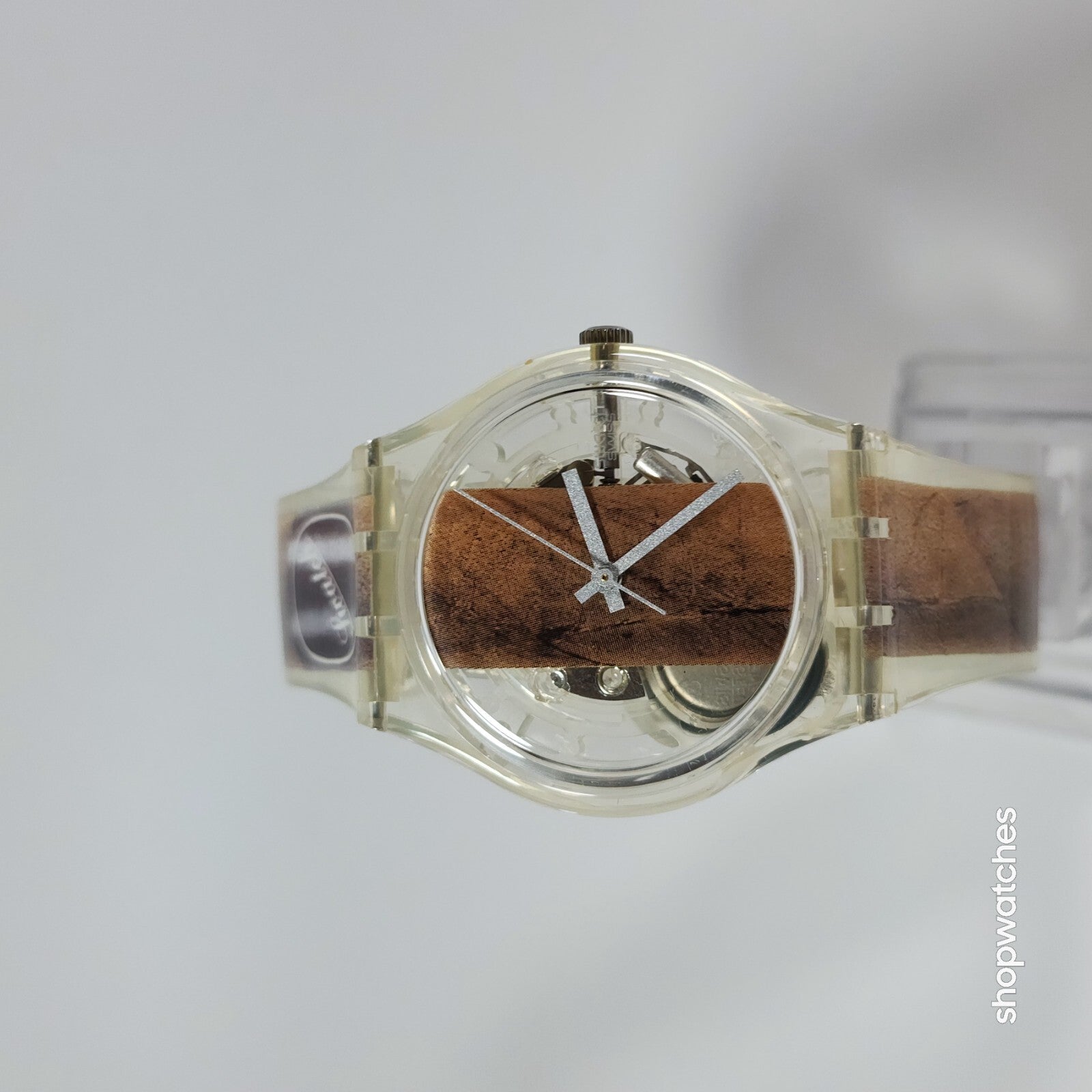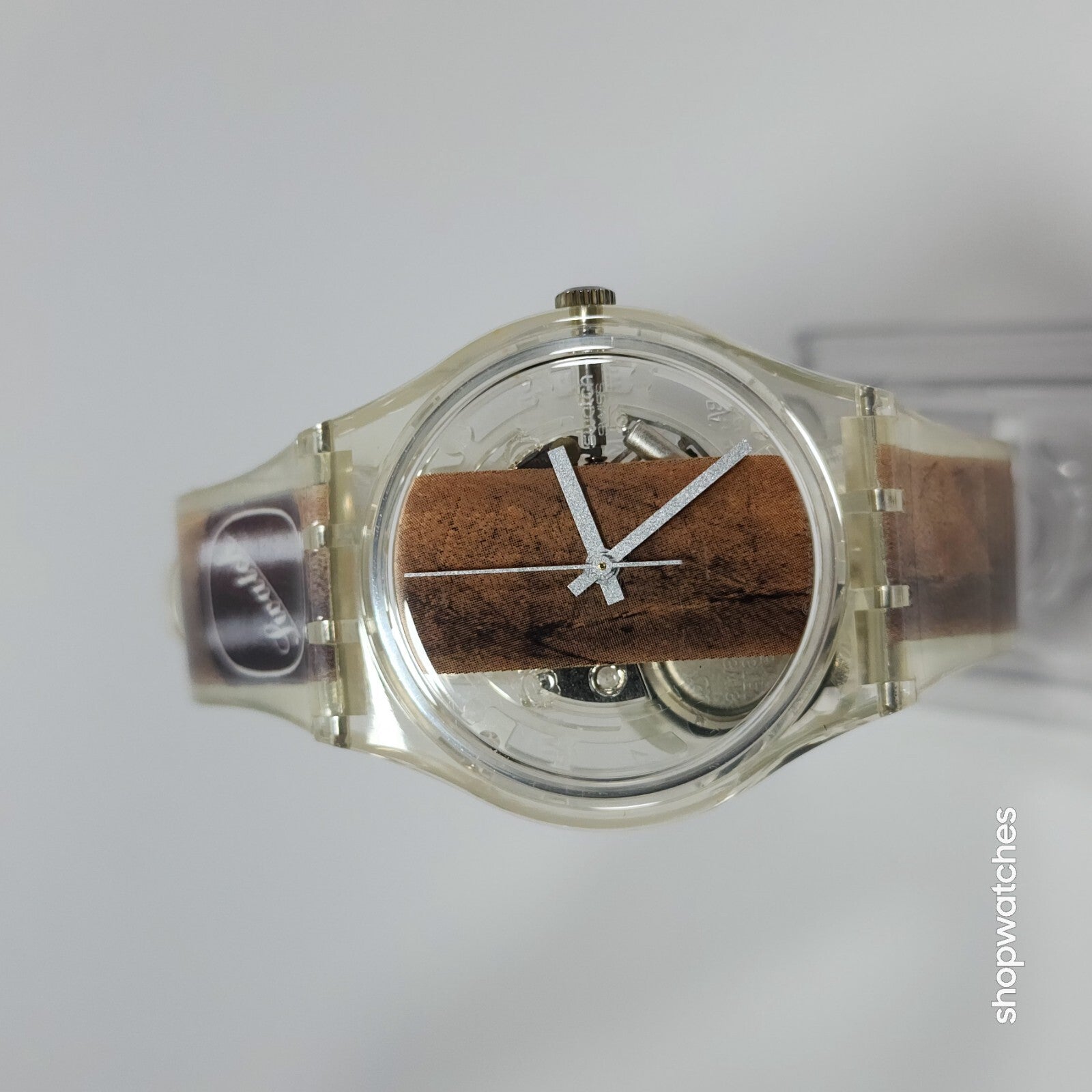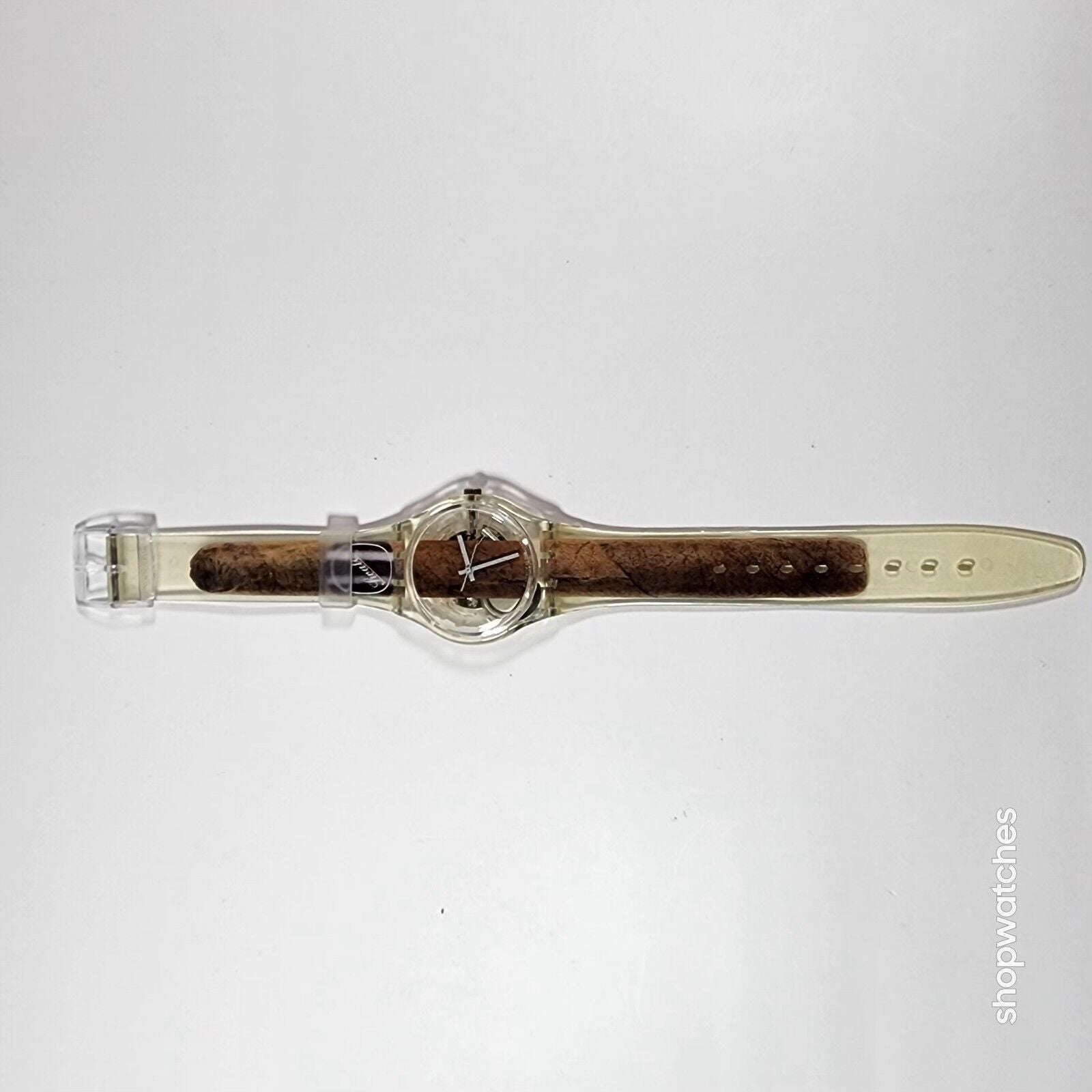 This Swatch Watch CIGAR GK250 is a limited edition vintage piece from the 1990s. The watch features a clear plastic case and a two-piece plastic strap. The dial is also clear, with no hour marks, and features a 12-hour analog display. The watch is water-resistant up to 30 meters and comes with its original box, papers, and manual/booklet.