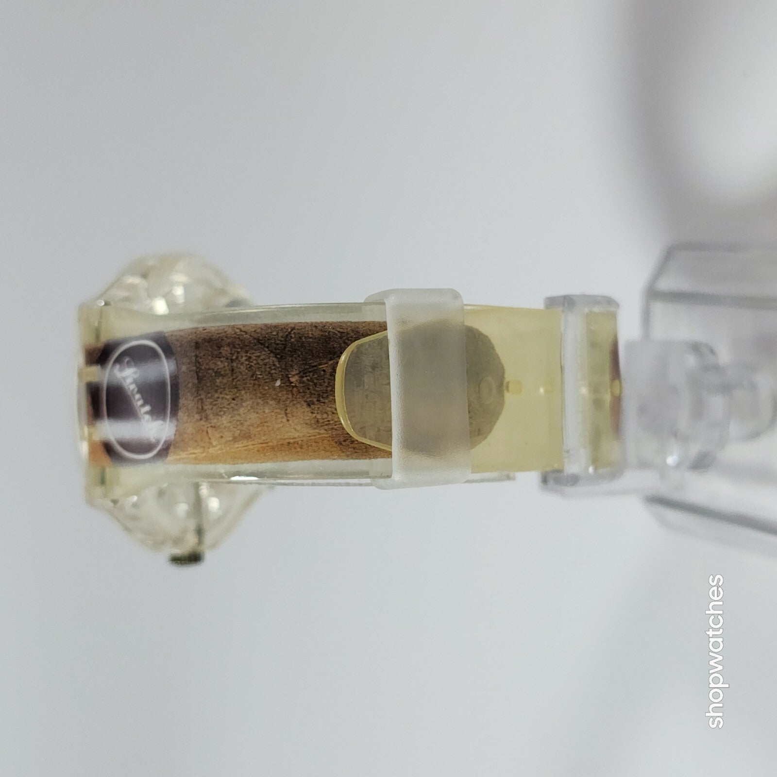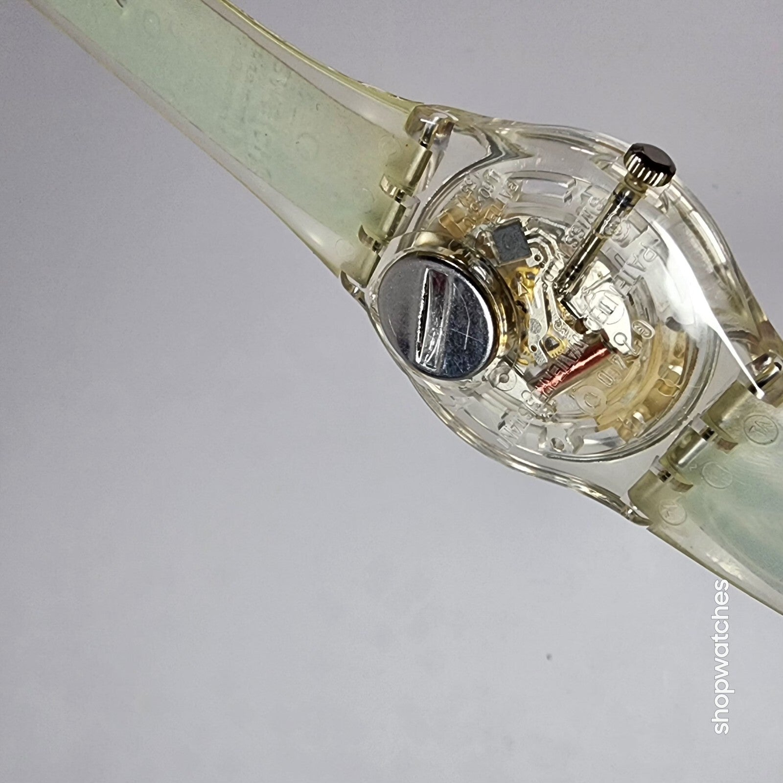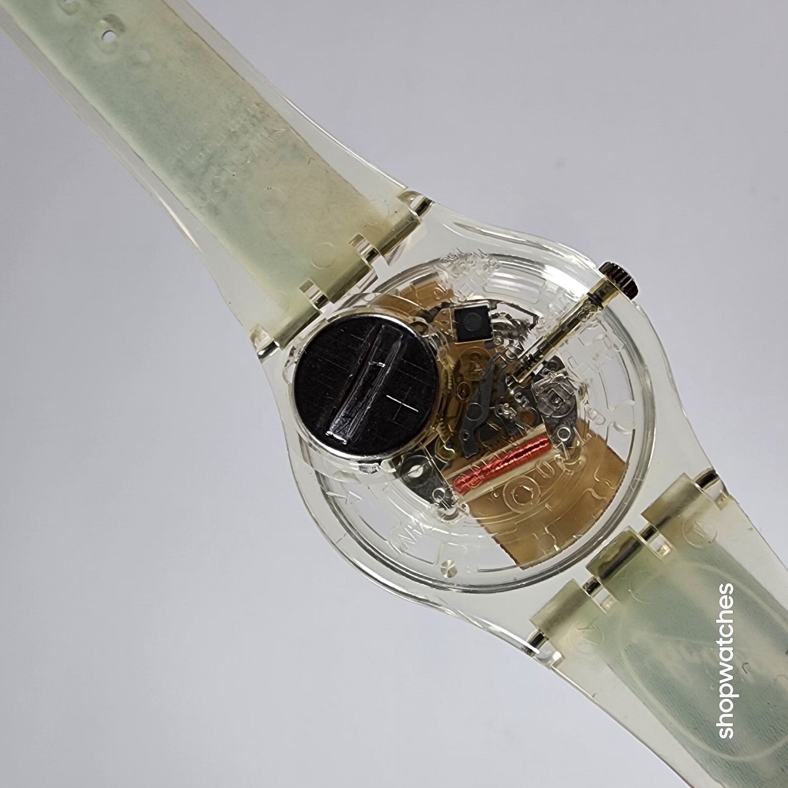This Swatch Watch CIGAR GK250 is a limited edition vintage piece from the 1990s. The watch features a clear plastic case and a two-piece plastic strap. The dial is also clear, with no hour marks, and features a 12-hour analog display. The watch is water-resistant up to 30 meters and comes with its original box, papers, and manual/booklet.