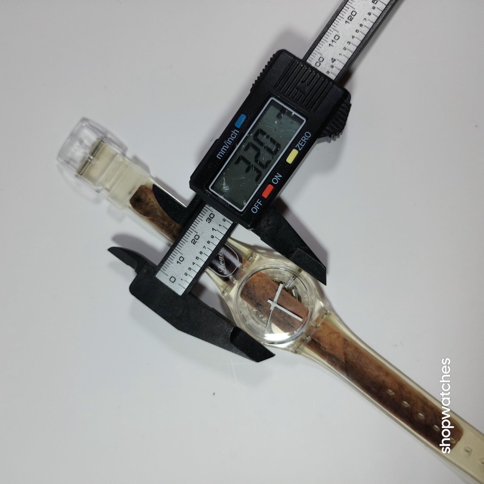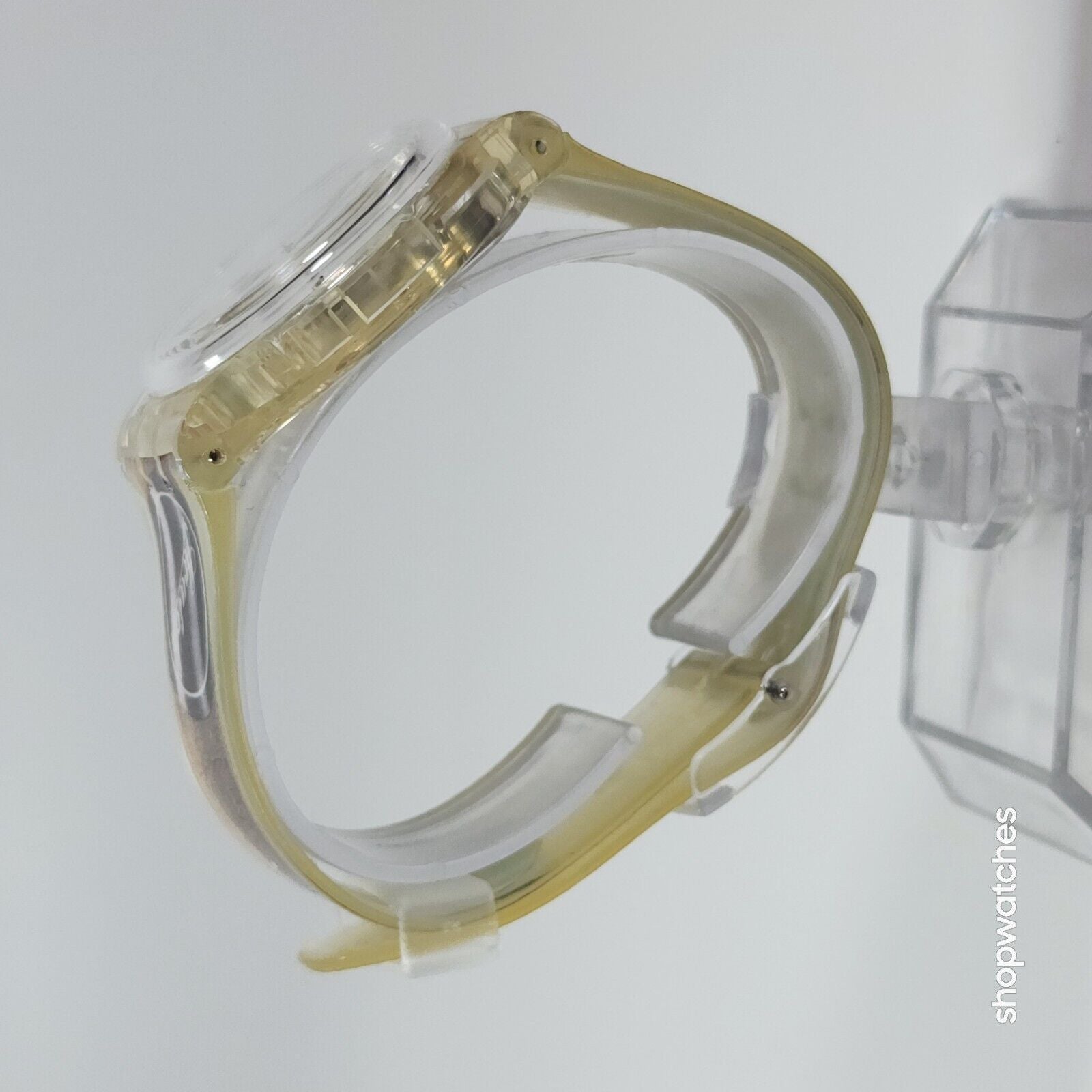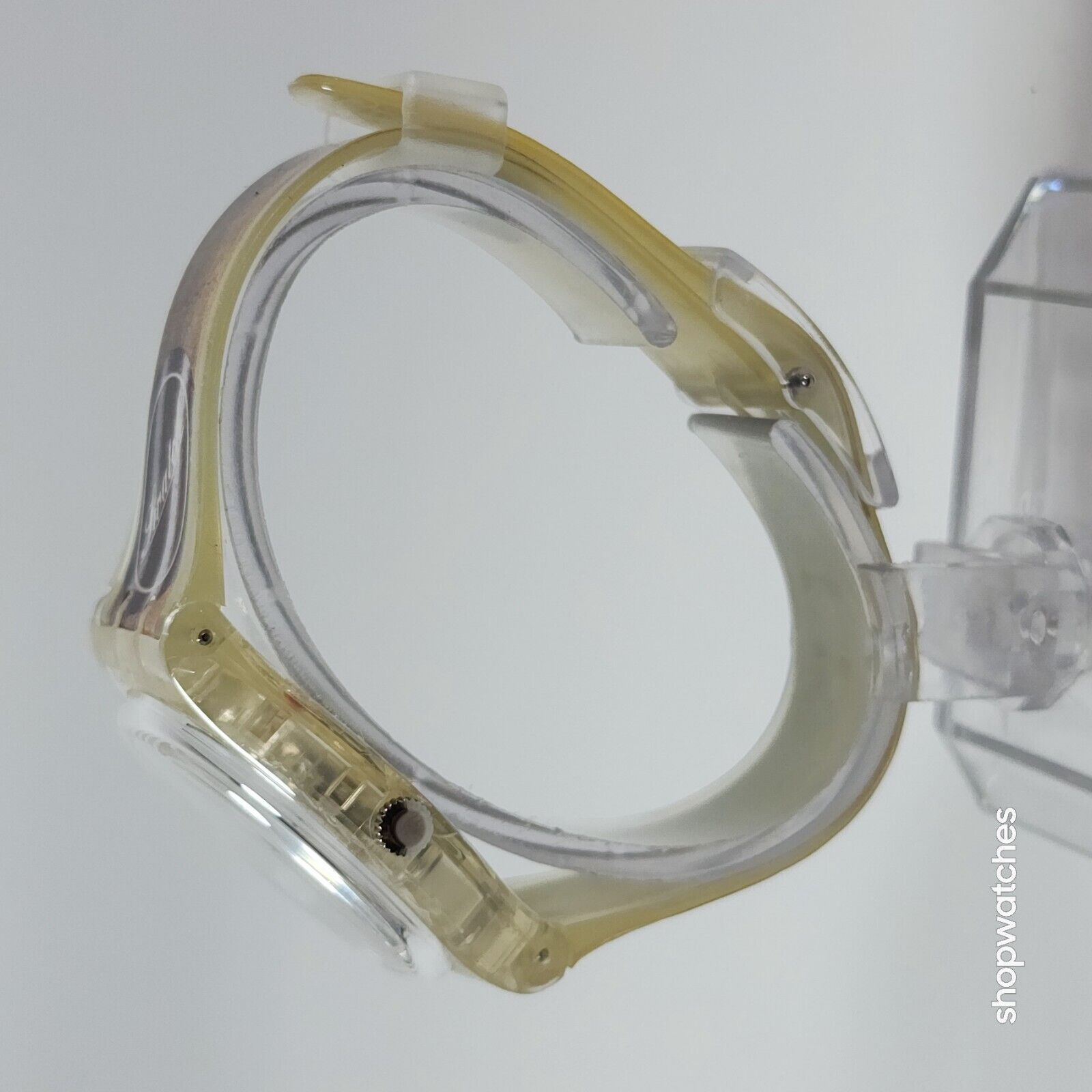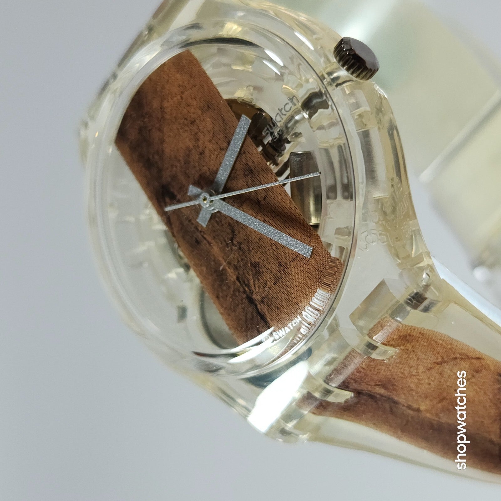 This Swatch Watch CIGAR GK250 is a limited edition vintage piece from the 1990s. The watch features a clear plastic case and a two-piece plastic strap. The dial is also clear, with no hour marks, and features a 12-hour analog display. The watch is water-resistant up to 30 meters and comes with its original box, papers, and manual/booklet.