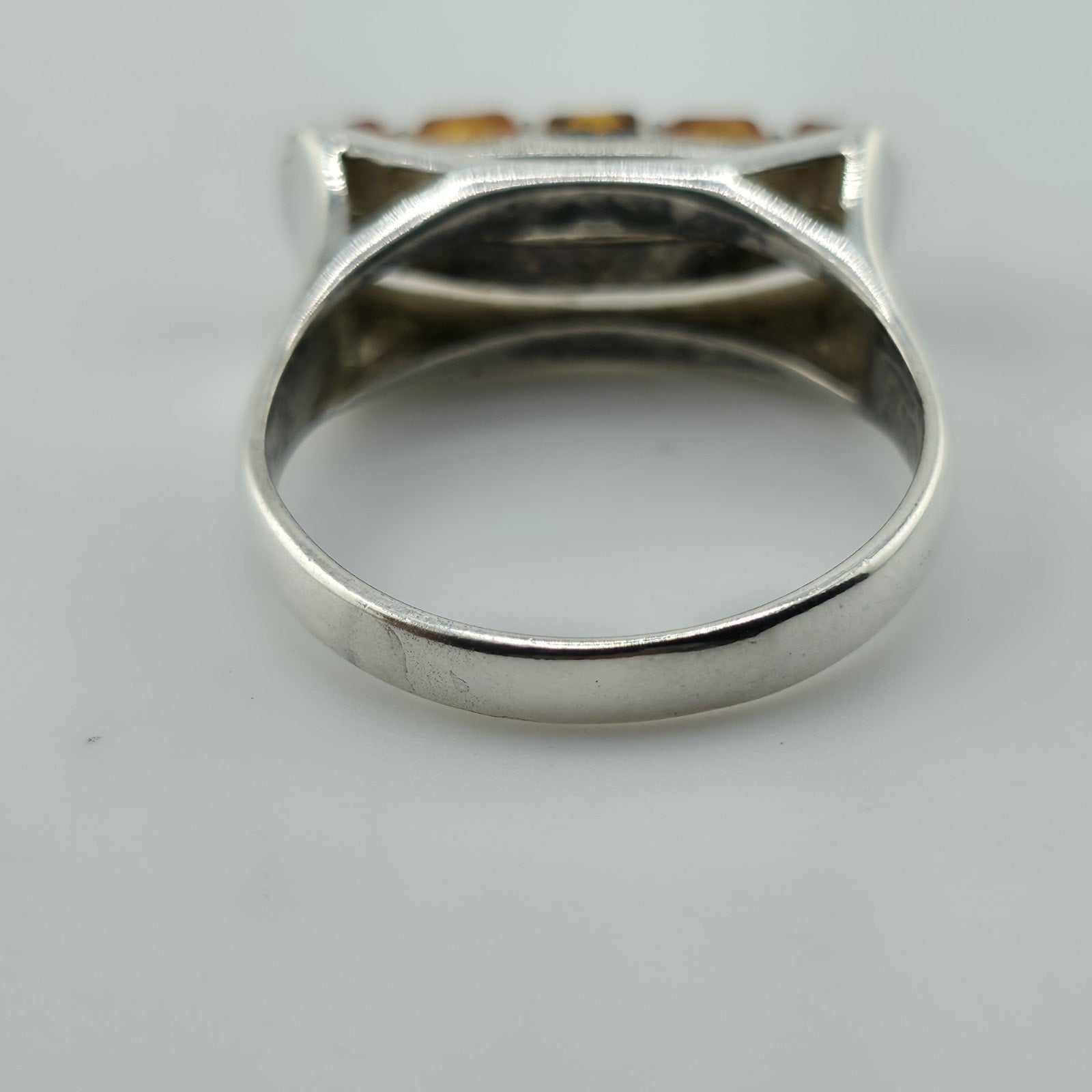 Beautiful vintage Baltic amber ring set in solid .925 sterling silver, stamped Poland 925. Features a row of natural amber stones in warm honey and cognac tones with visible inclusions, giving each stone a unique organic look.