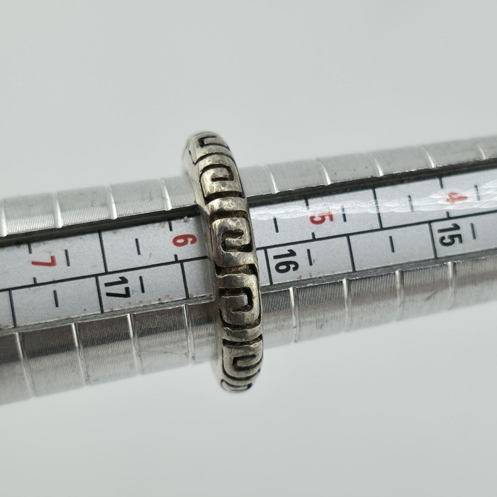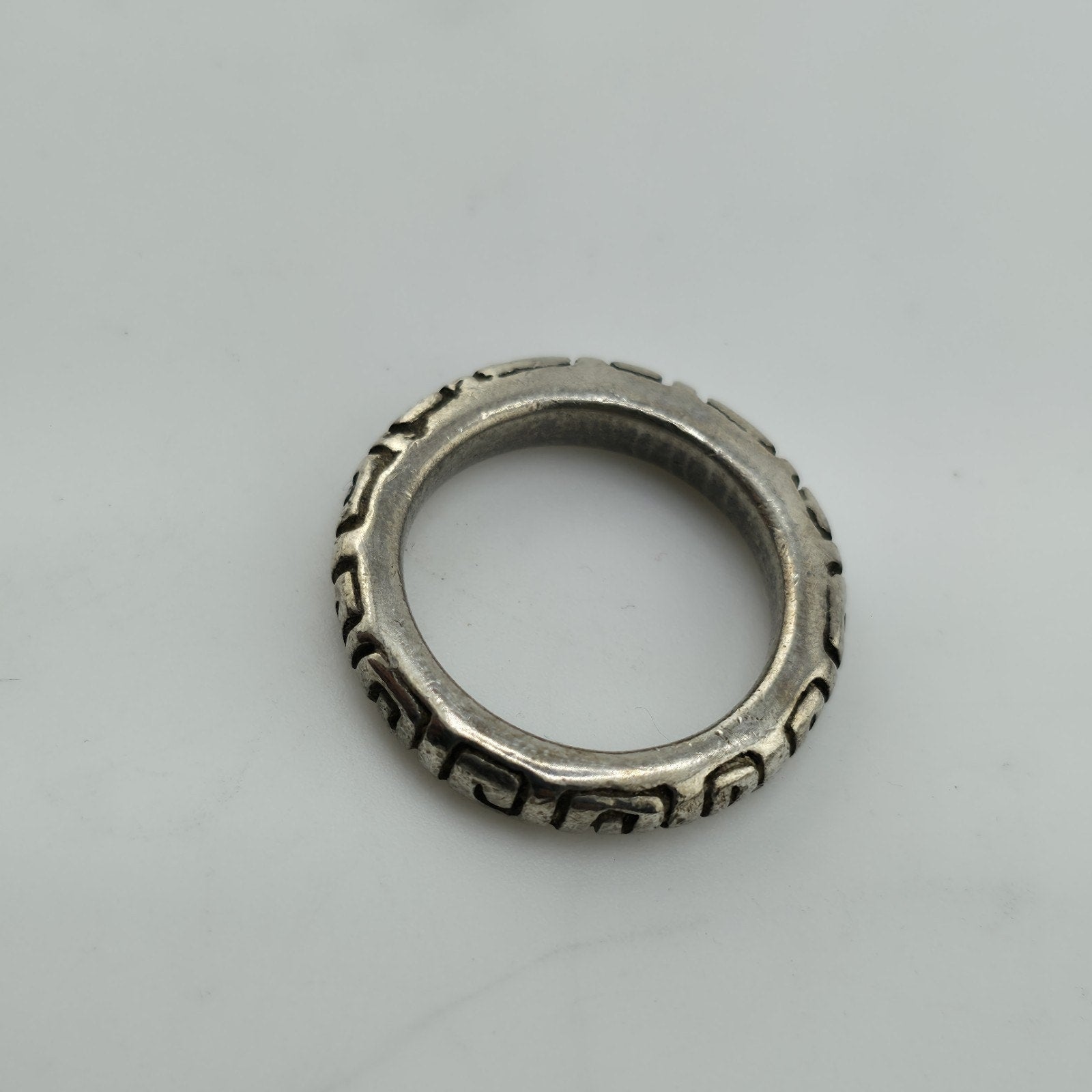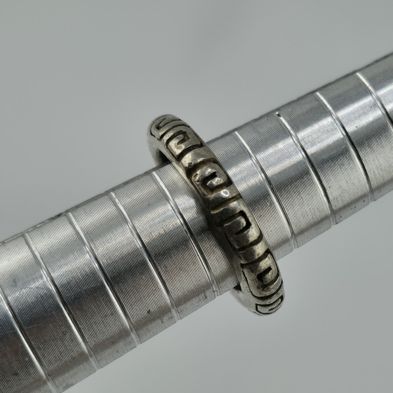 Authentic vintage Mexico 925 sterling silver ring featuring a classic Greek Key (meander) pattern engraved around the band.